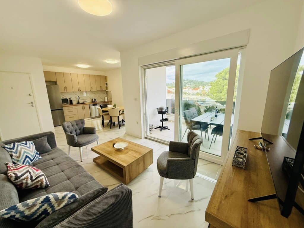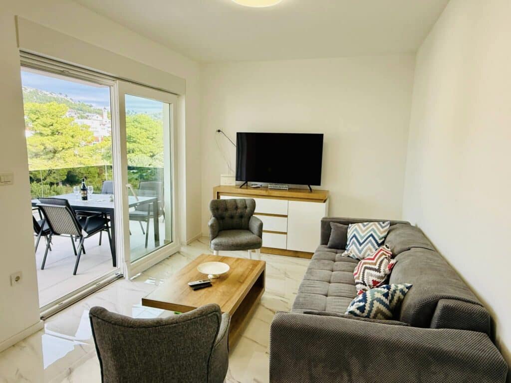 Apartmán má dvě ložnice, maximálně pro 4 osoby + dětská postýlka. DEA je součástí moderní Aqua Beach Residence v Žaboriči jen 40 m od pláže. Úžasný apartmán, úžasné místo = úžasná dovolená.