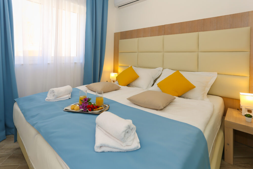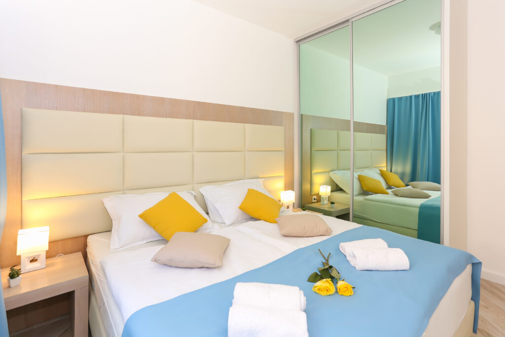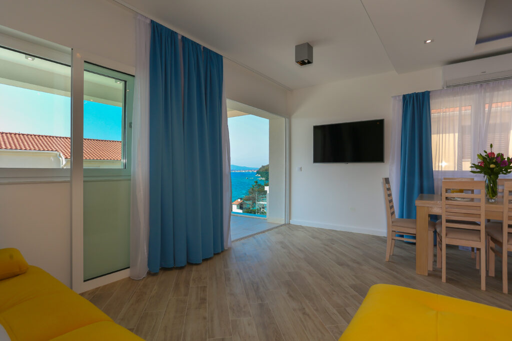Apartmán Yellow s terasou a výhledem na moře se nachází ve 2. patře a má prostorný obývací pokoj s plně vybavenou moderní kuchyní s myčkou nádobí. Dvě ložnice, přičemž každá má klimatizaci a podlahové vytápění. Super kvalitní matrace na postelích jsou zárukou odpočinkové dovolené. V koupelně je sprchový kout, fén a samozřejmě pračka. V apartmánu nechybí velkoplošná TV a rychlá wifi. Na terase je k dispozici posezení, lehátka a slunečník.