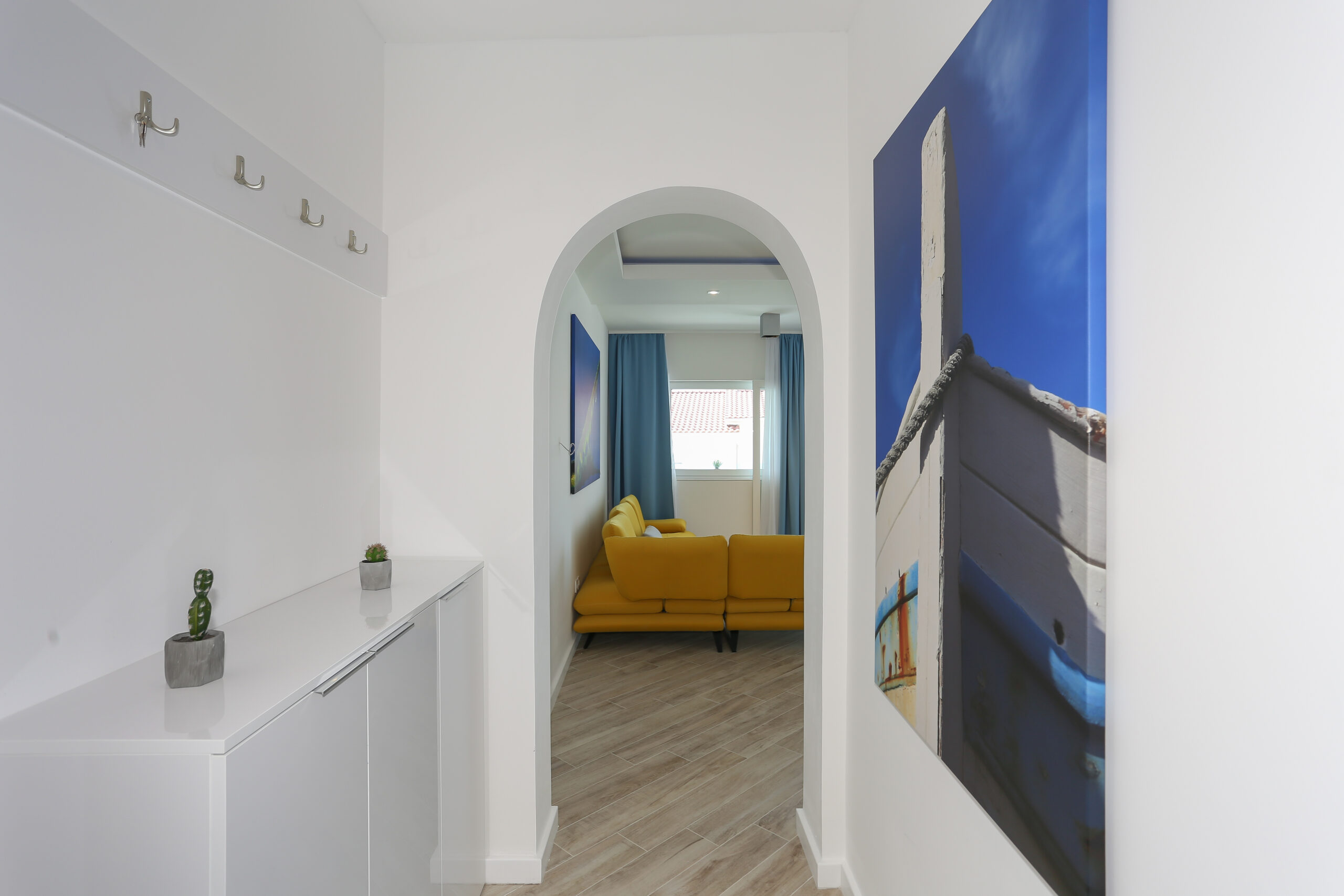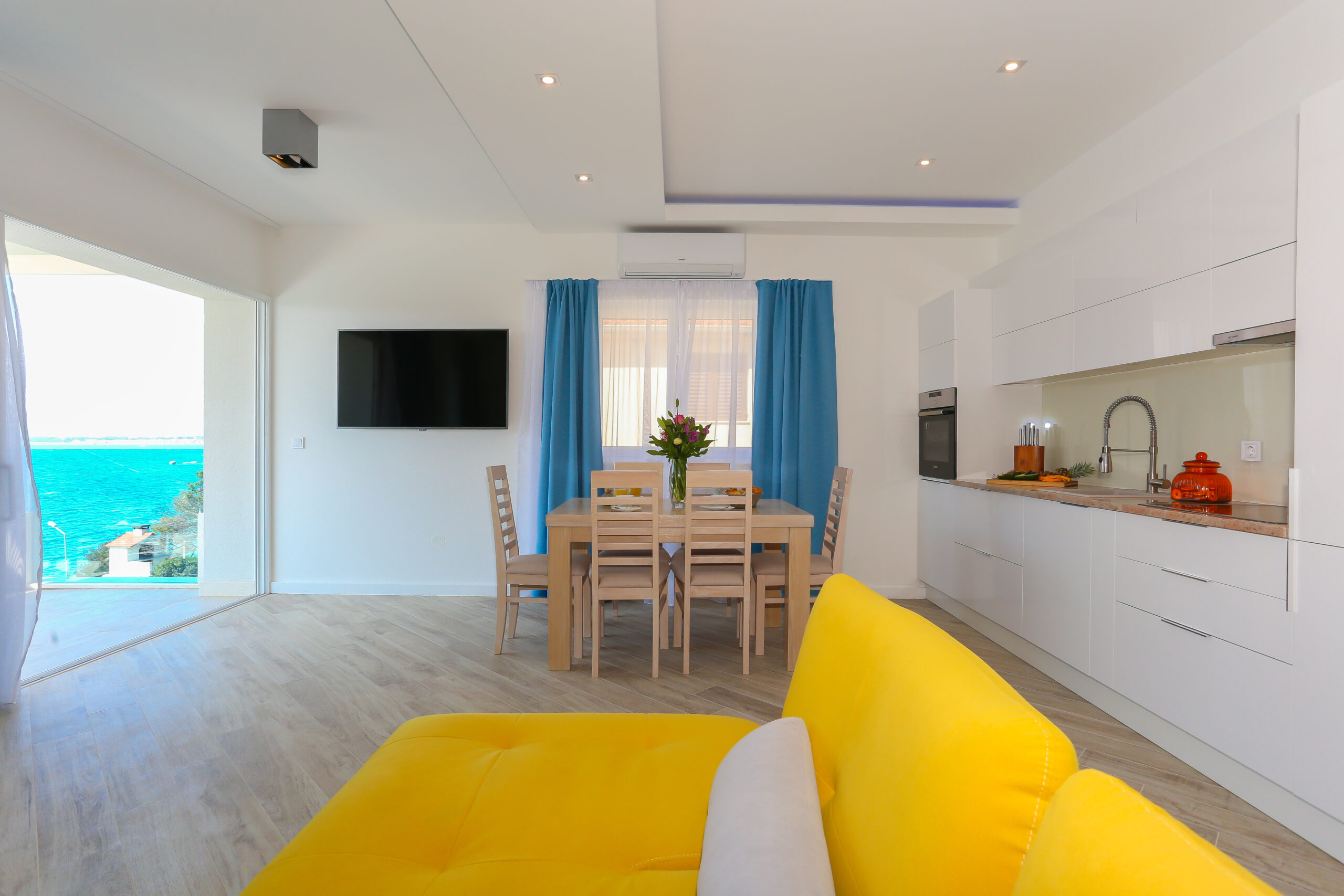 Apartmán Yellow s terasou a výhledem na moře se nachází ve 2. patře a má prostorný obývací pokoj s plně vybavenou moderní kuchyní s myčkou nádobí. Dvě ložnice, přičemž každá má klimatizaci a podlahové vytápění. Super kvalitní matrace na postelích jsou zárukou odpočinkové dovolené. V koupelně je sprchový kout, fén a samozřejmě pračka. V apartmánu nechybí velkoplošná TV a rychlá wifi. Na terase je k dispozici posezení, lehátka a slunečník.