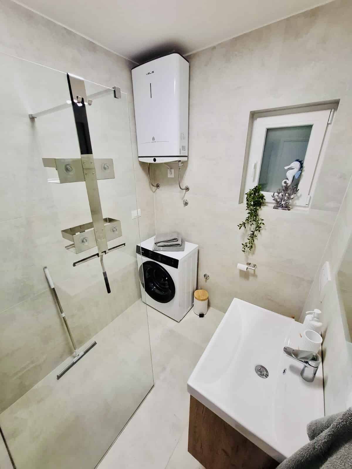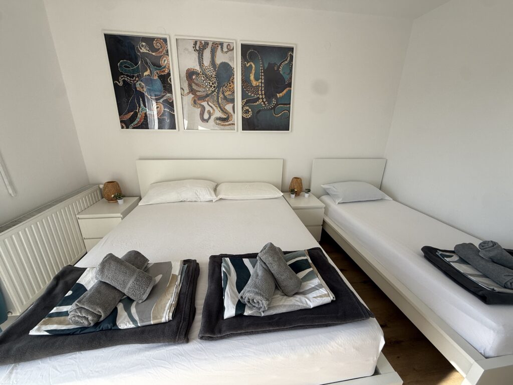 Moře je odtud pouhých 60 metrů, stačí sejít krátkou uličkou a jste na klidné pláži s betonovými platy a úseky s kamínky. Lidi je tu minimum, protože tahle část Žaboriče je mimo hlavní centrum — a právě proto je tak oblíbená.