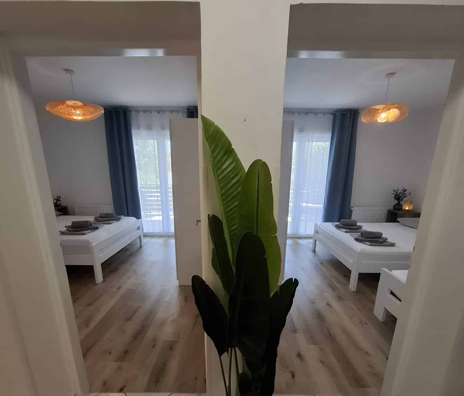Jsou to dva samostatné apartmány v jednom domě, každý má vlastní velkou terasu, dvě ložnice, plně vybavenou kuchyň s myčkou, krásný obývák a relaxační venkovní zónu. A samozřejmě — jako vždy u nás — paddleboard zdarma.