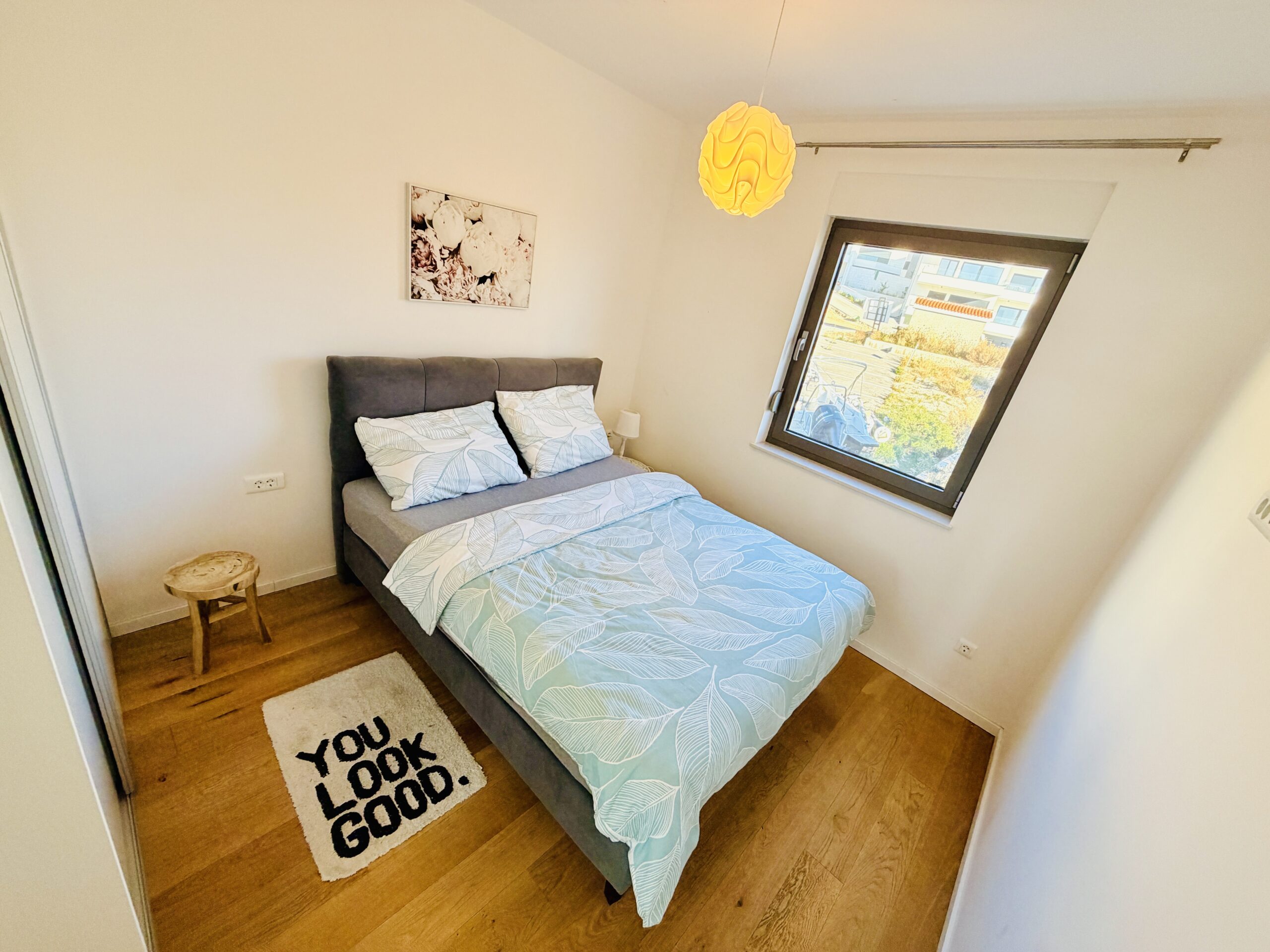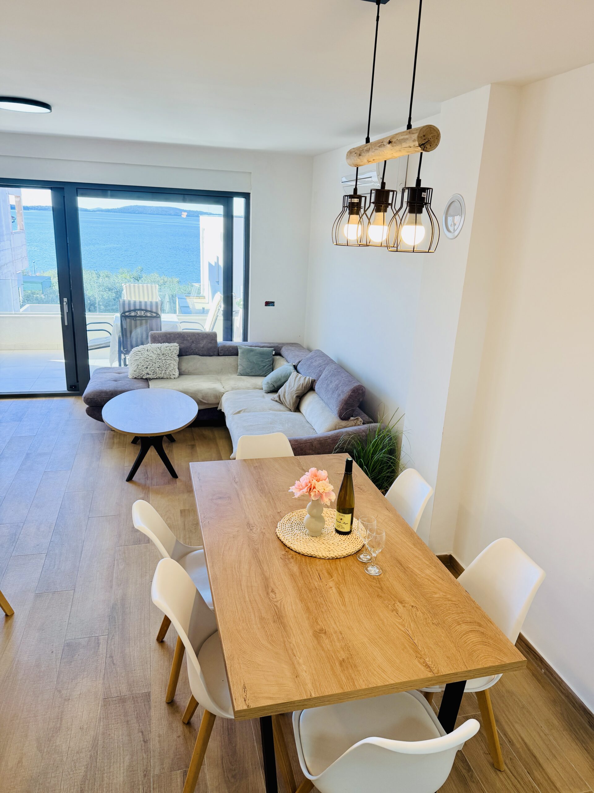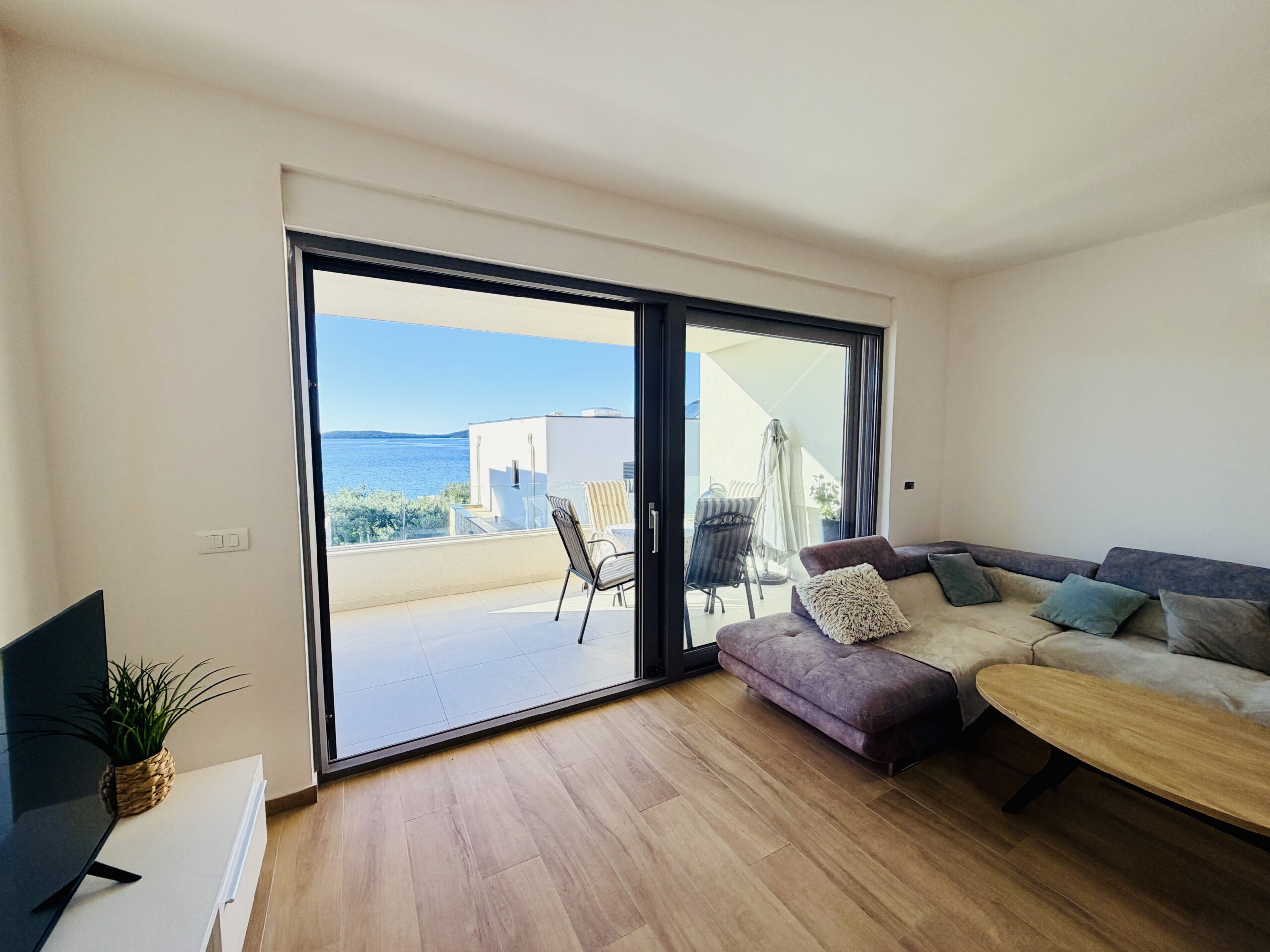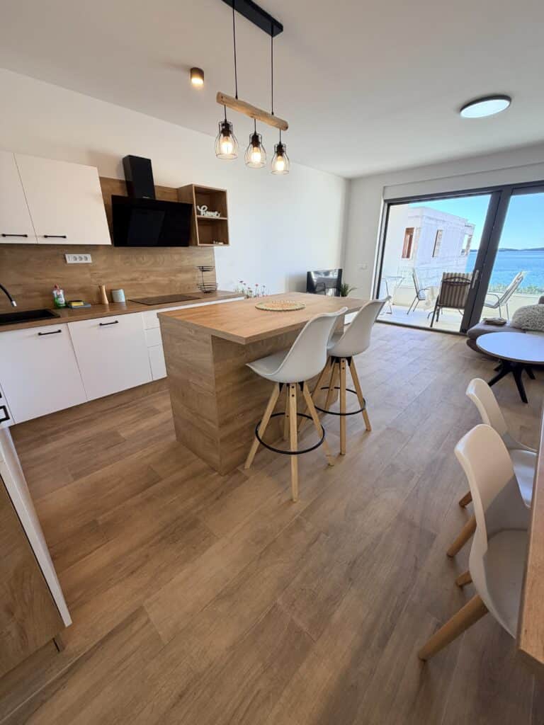 Moderní dvouložnicový apartmán s terasou a výhledem na moře v klidné části městečka Žaborič jen 50m od přírodní písečné pláže! Promenáda s vyhlášenou restaurací Shark, obchod, pizzerie, palačinkárna, dětské hřiště či nafukovací aquapark je jen několik minut chůze odsud. Zkrátka vše „za rohem“.