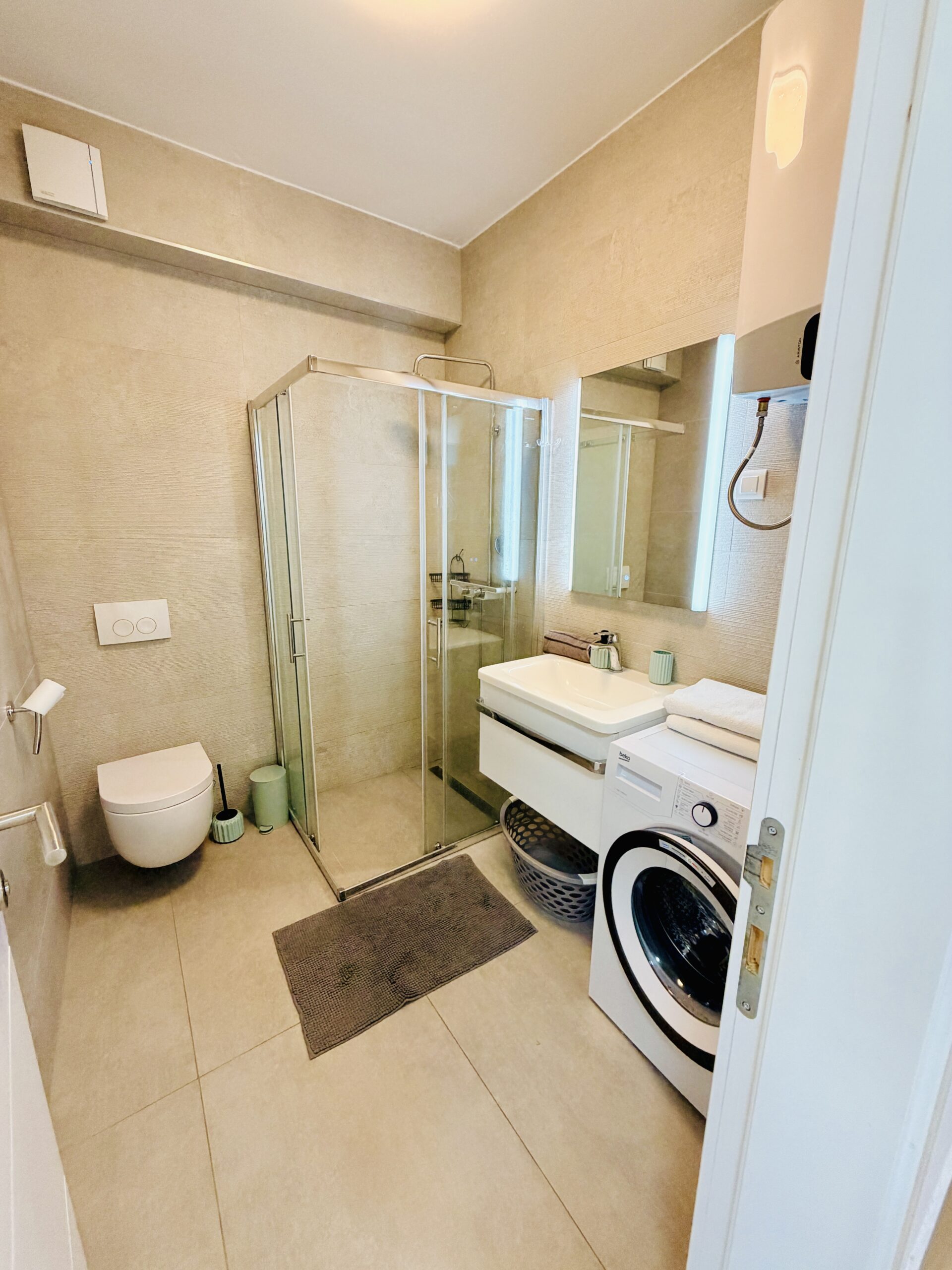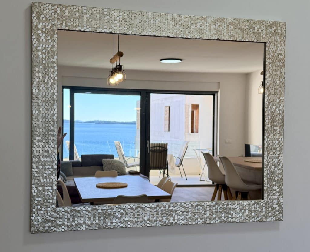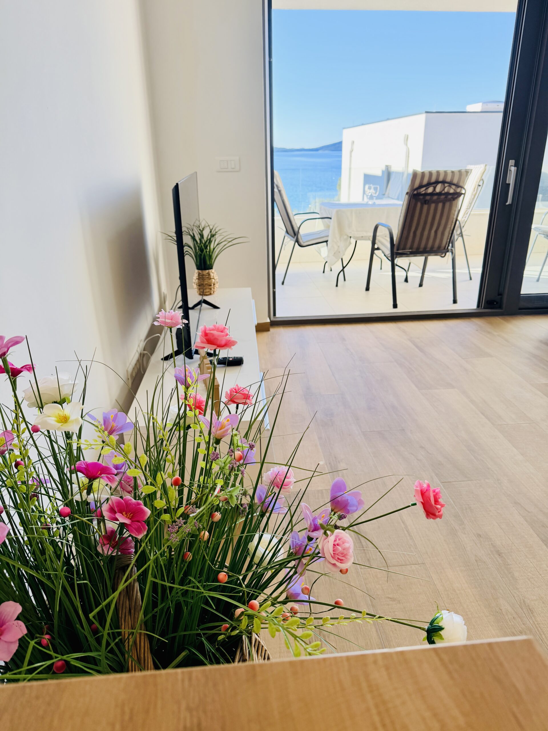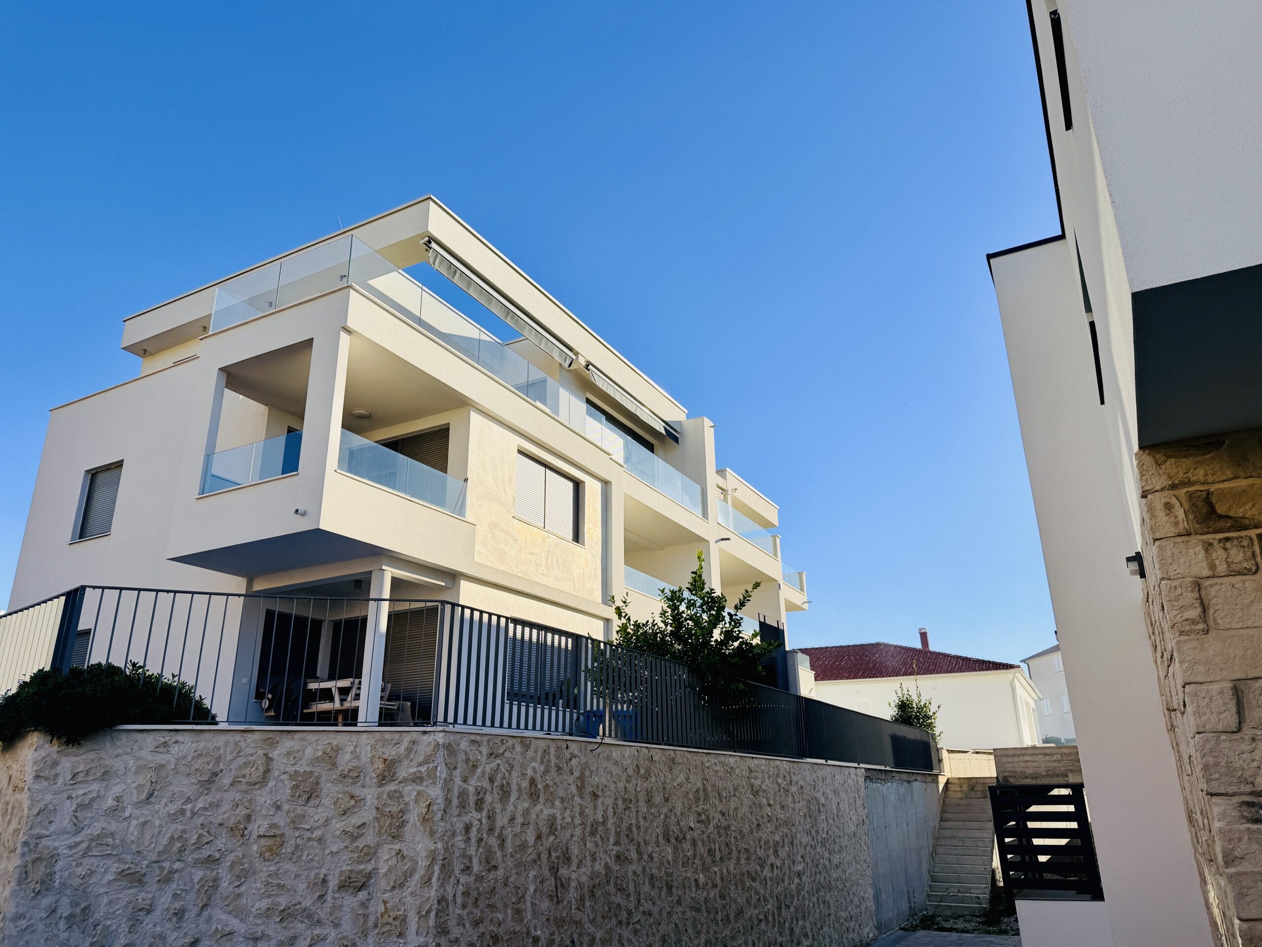 Moderní dvouložnicový apartmán s terasou a výhledem na moře v klidné části městečka Žaborič jen 50m od přírodní písečné pláže! Promenáda s vyhlášenou restaurací Shark, obchod, pizzerie, palačinkárna, dětské hřiště či nafukovací aquapark je jen několik minut chůze odsud. Zkrátka vše „za rohem“.