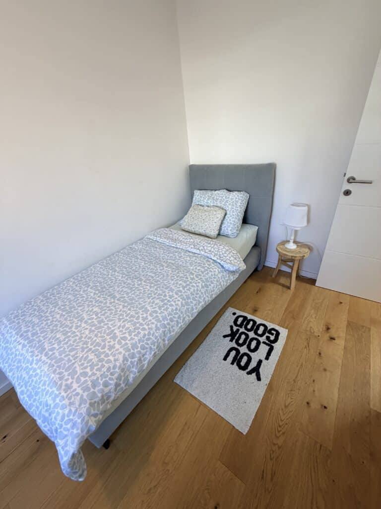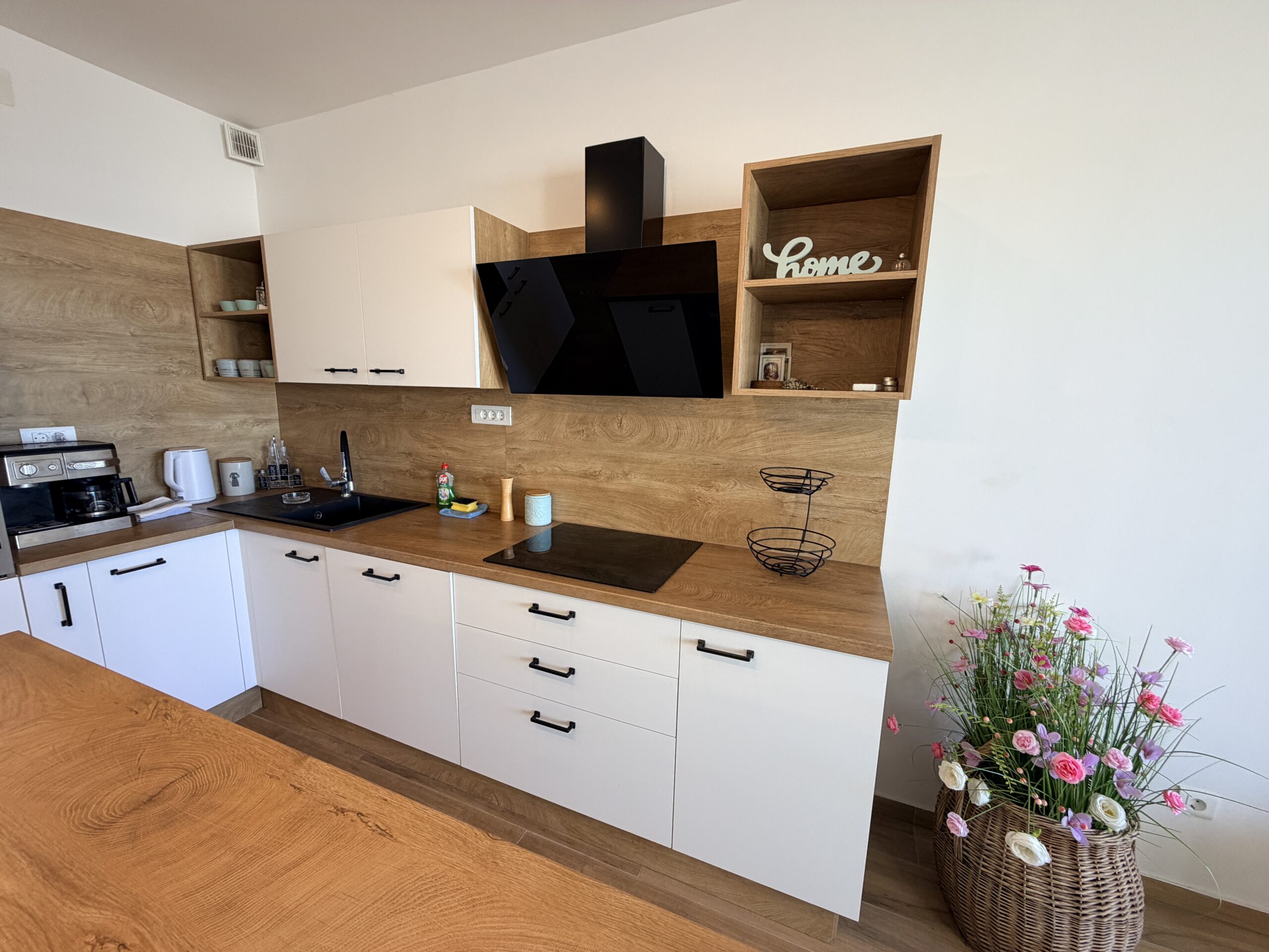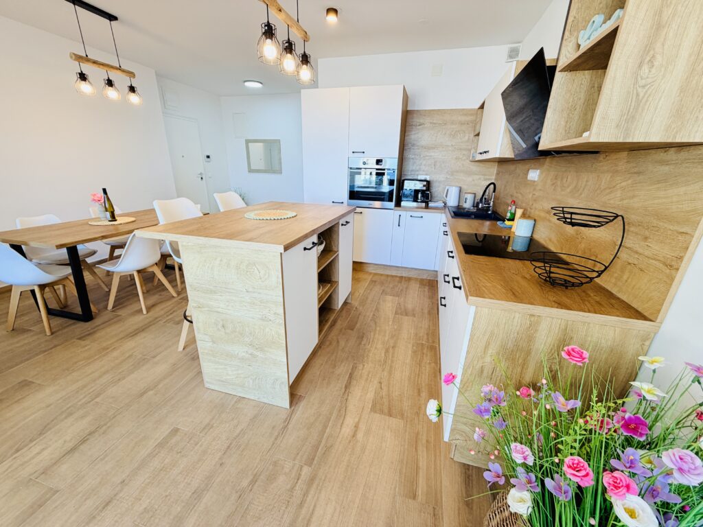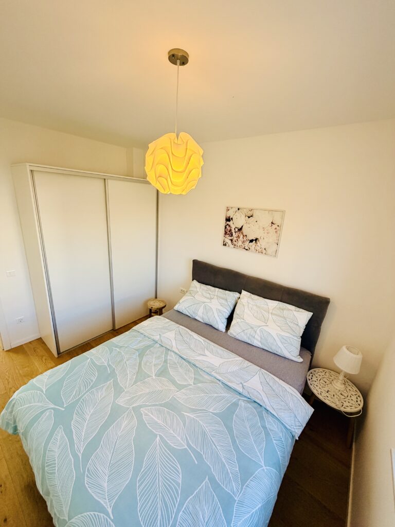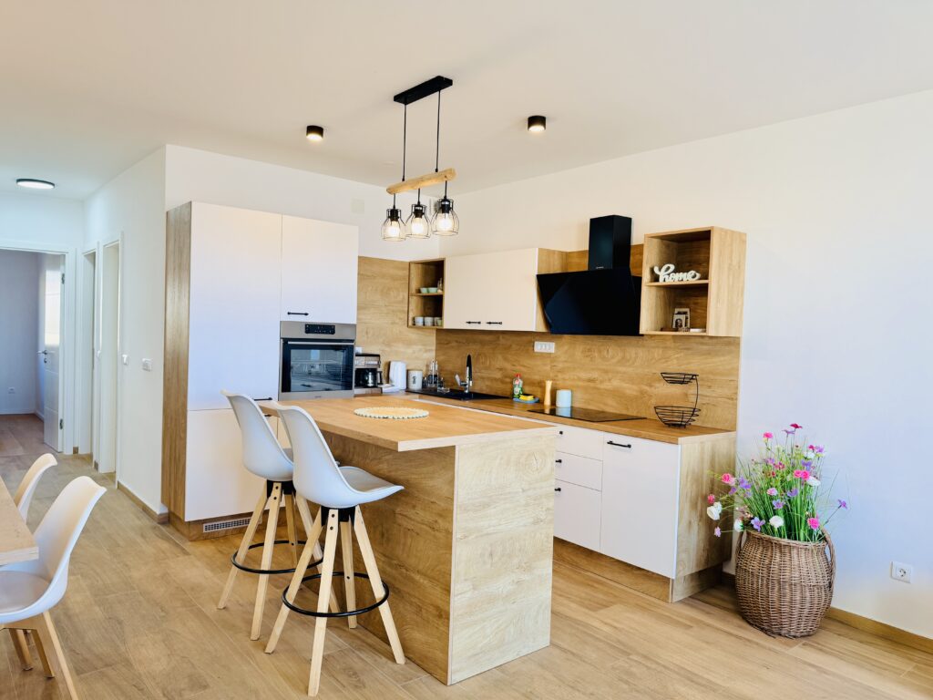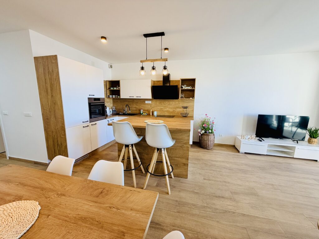 Apartmán nabízí dvě ložnice (jednu s manželskou postelí a druhou se dvěma oddělenými lůžky), plně vybavenou kuchyň, obývací prostor s rozkládací pohovkou, jednu koupelnu s wc + samostatné wc a prostornou terasu s posezením a grilem. Součástí vybavení je klimatizace, Wi-Fi, TV, pračka, myčka i paddleboard zdarma 🏄‍♀️