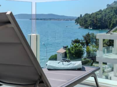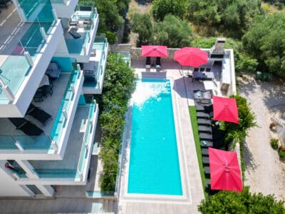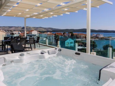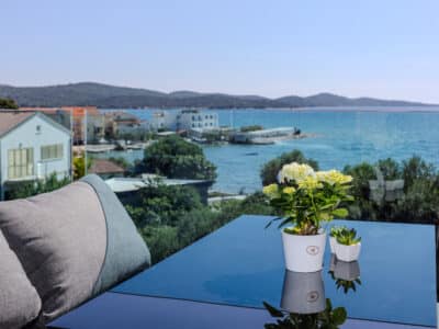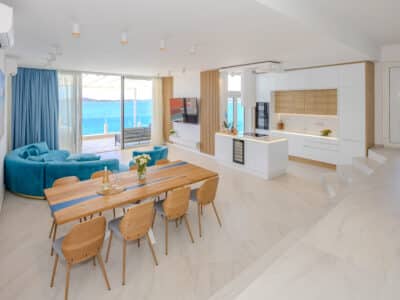 Luxusní apartmány ve Ville Blue Žaborič se nacházejí pouhých 20 metrů od přírodní písečné pláže. Mají k dispozici vyhřívaný bazén, vířivku, posilovnu, paddleboard, gril, lehátka a slunečník na pláž. Všechny apartmány mají nádherný výhled na moře a na západ slunce.